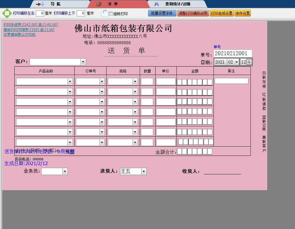 佛山市纸箱包装有限公司送货单送货单打印软件