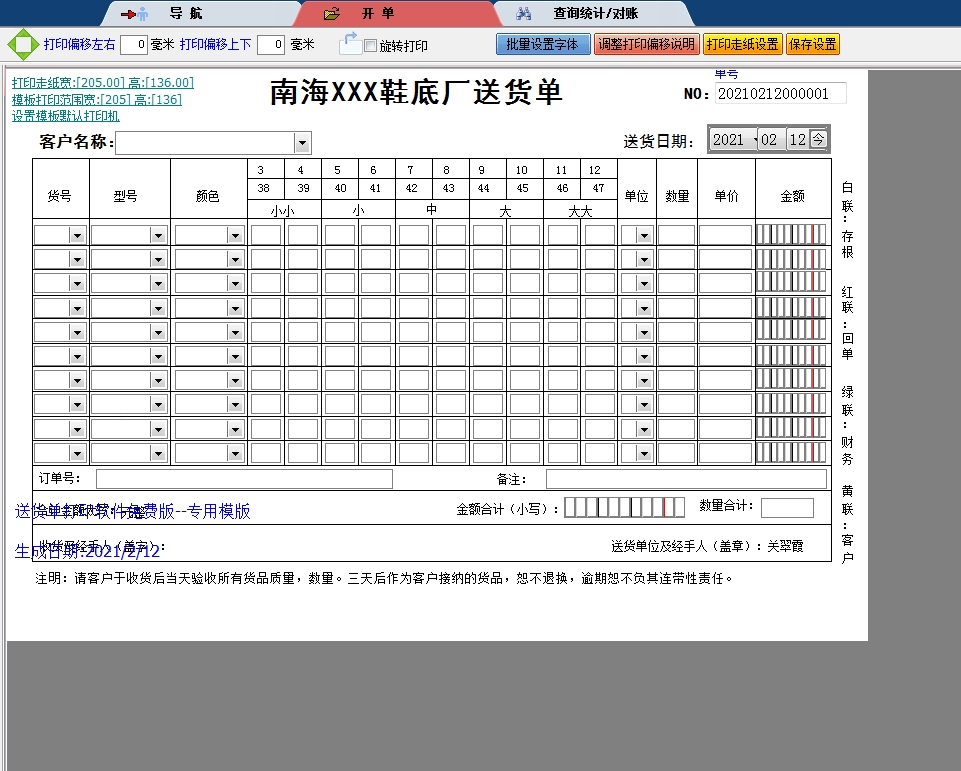 注明:请客户于收货后当天验收所有货品质量,数量。三天后作为客户接纳的货品,恕不退换,逾期恕不负其连带性责任。